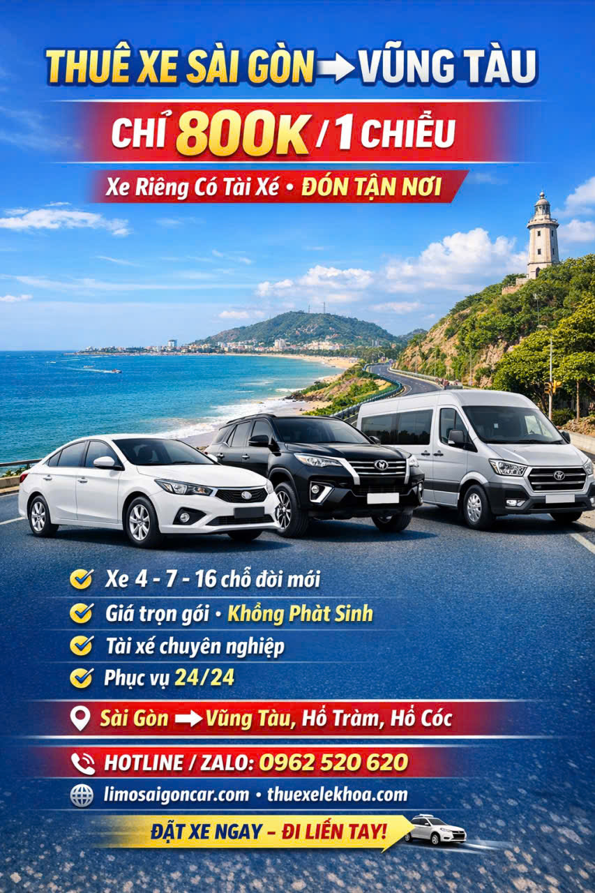 👉 LÊ KHOA TRAVEL – https://limosaigoncar.com/ cung cấp dịch vụ thuê xe Sài Gòn → Vũng Tàu giá trọn gói chỉ 800.000đ/xe 4 chỗ, phục vụ 24/7, xe đời mới, tài xế chuyên tuyến.